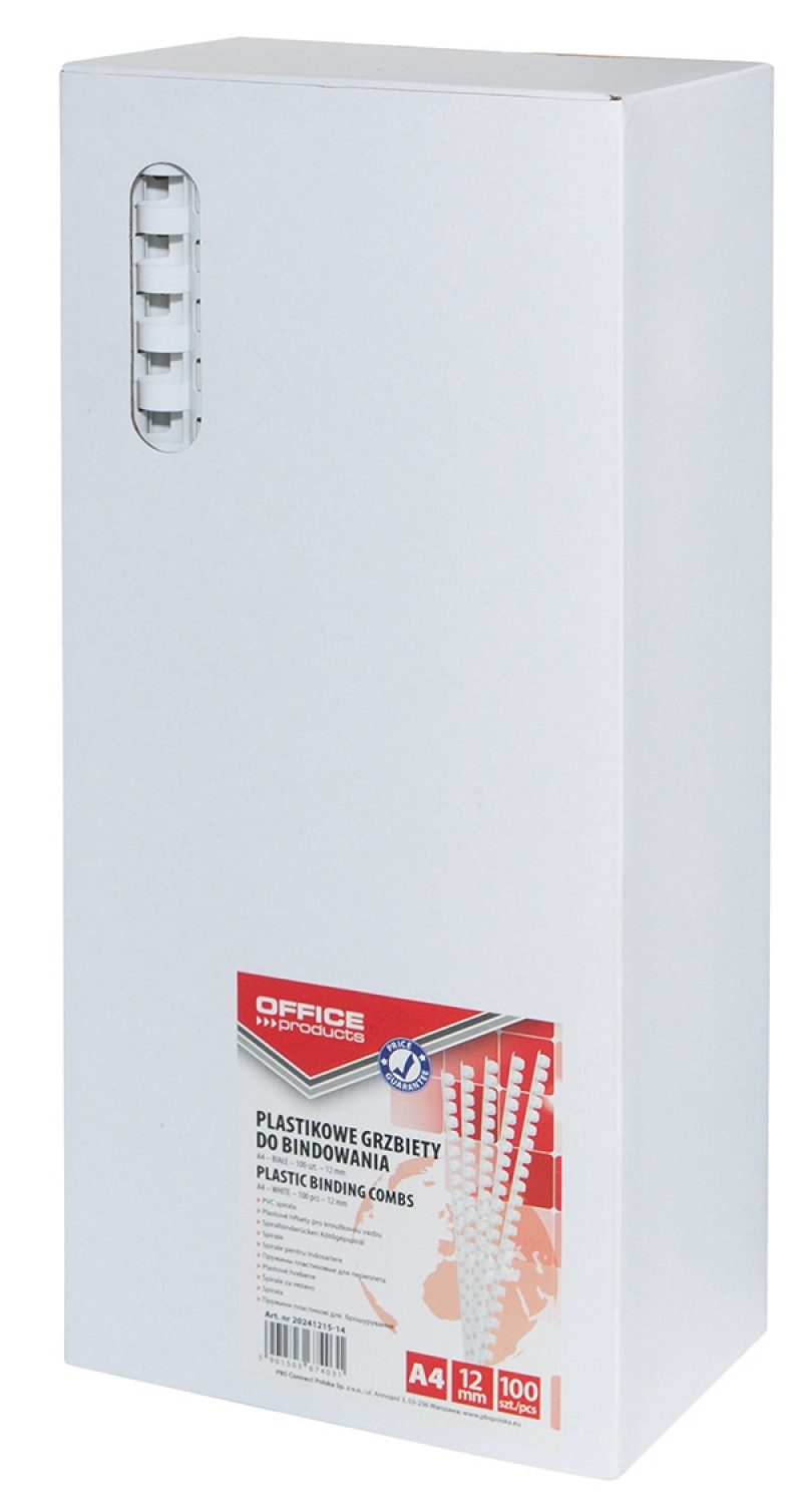 Grzbiety do bindowania OFFICE PRODUCTS, A4, 12mm (95 kartek), 100 szt., białe