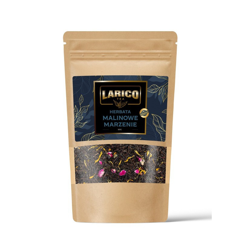 LARICO HERBATA MALINOWE MARZENIE, to kompozycja czarnej i zielonej Chińskiej herbaty typu Sencha z dodatkiem kwiatów czerwonej róży, płatków nagietka i kawałków malin. Herbata o wyjątkowym naturalnym aromacie.