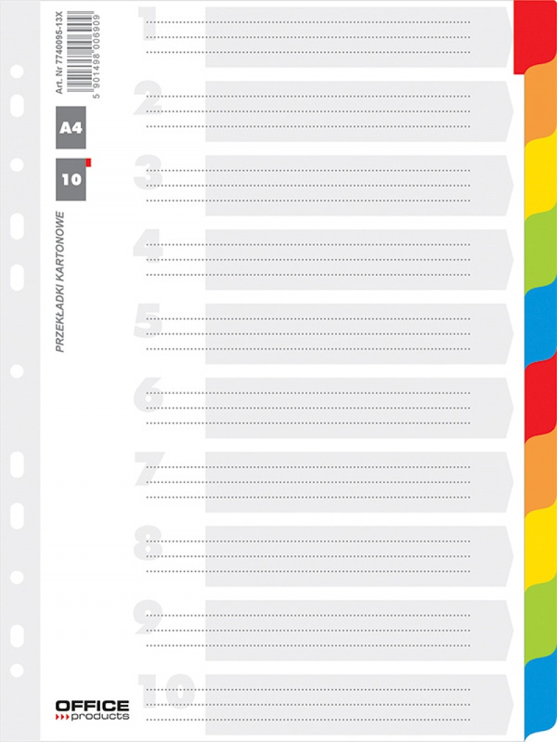 Przekładki OFFICE PRODUCTS, karton, A4, 227x297mm, 10 kart, lam. indeks, mix kolorów