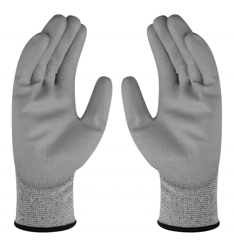 rękawica dziana ze splotu włókien polietylenowych o ultra wysokiej wytrzymałości (UHPPE), włókna szklanego i miękkich włókien elastycznych typu spandex w kolorze szarym