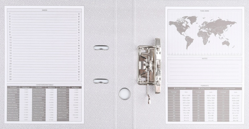 wewnątrz wyklejka papierowa z indeksem, tabelą formatów, mapą stref czasowych oraz miejscem na notatki