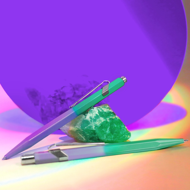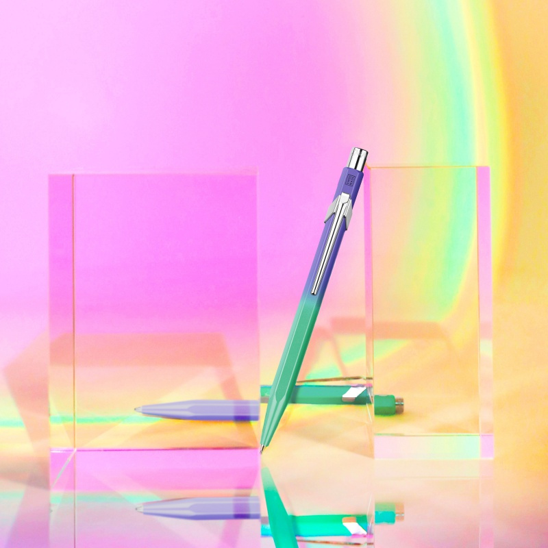 Kultowy długopis 849 z aluminiowym, sześciokątnym korpusem w kolorze, który przechodzi z ciemnego fioletu do jasnej zieleni. Klips i przycisk są wykonane z niklowanej stali. Długopis ten został zaprojektowany z myślą o trwałości, jest nasycony kreatywnością, know-how i silnymi wartościami Caran d'Ache. Długopis posiada przyciskowy mechanizm wysuwu wkładu. Wyposażony w bardzo pojemny wkład długopisowy Goliath czarny F, który pozwoli nam na zapisanie 600 stron A4.