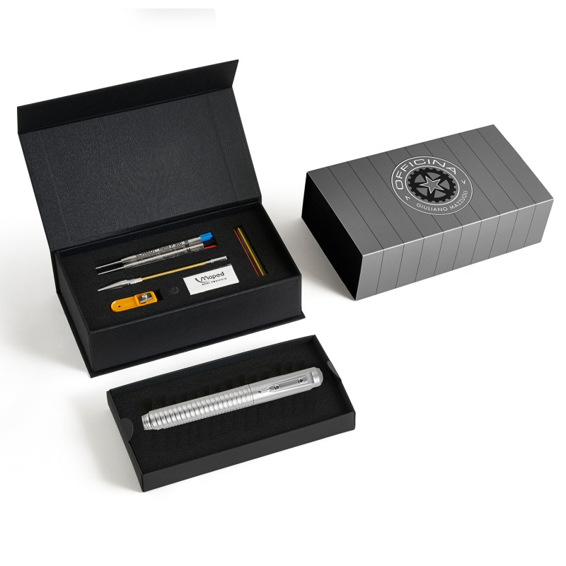 Długopis wykonany jest z wielką precyzją i dbałością o każdy szczegół. Zestaw zawiera wymienne wkłady długopisowe i ołówek, gumkę i temperówkę.
