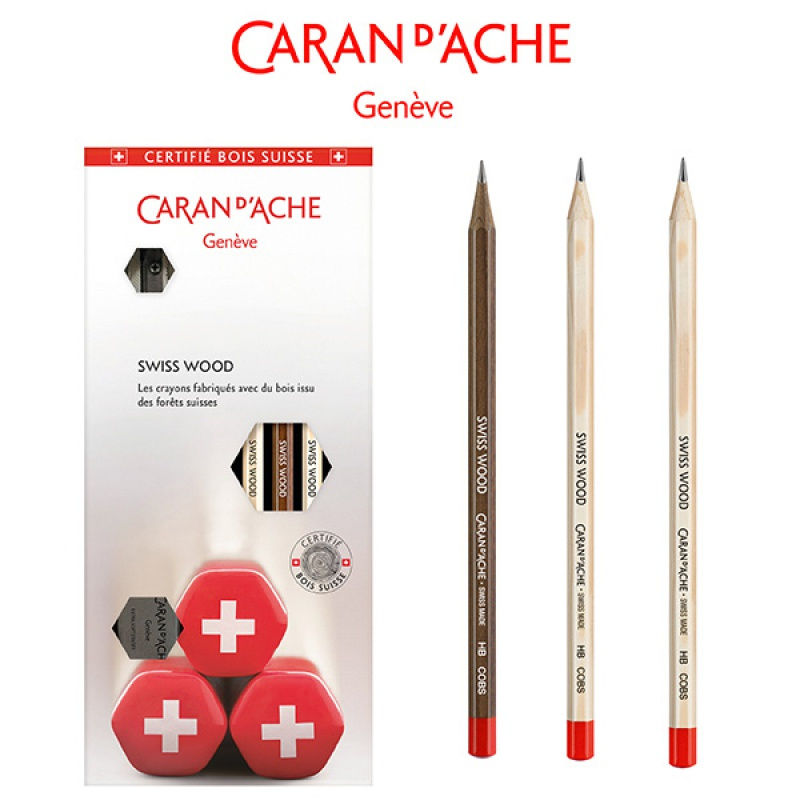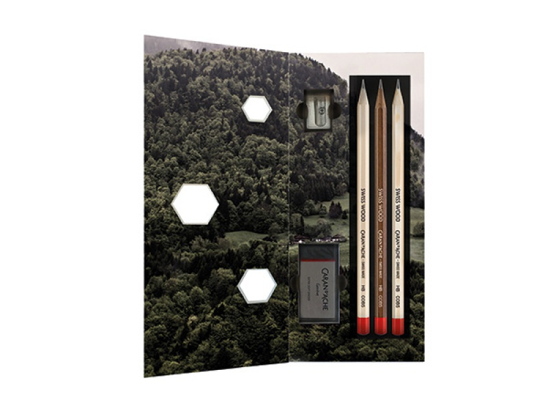 Aby uczcić piękno szwajcarskich lasów, Caran d'Ache stworzył specjalną wersję ołówka SWISS WOOD, w zupełnie nowym zestawie prezentowym. Zestaw ten składa się z 3 ołówków wykonanych z drewna sosnowego Grächen (VS) , drewna sosny zwyczajnej i buku Glovelier (JU) oraz z gumki i temperówki.